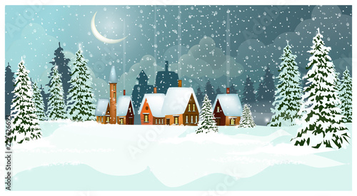Snowy Winter Landscape With Cottages And Fir Trees Vector