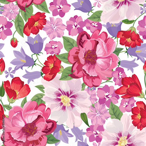 Spring Seamless Pattern Bright Flowers And Butterfly On Romantic
