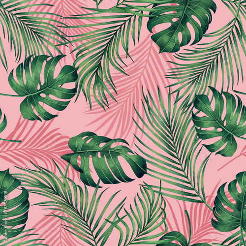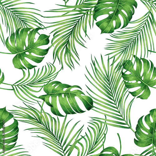 Watercolor Painting Monstera Coconut Leaves Seamless Pattern With