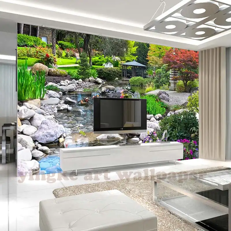 Digital Printing Large 3d Wallpaper Park Stone Stream Carp Scenery
